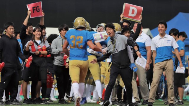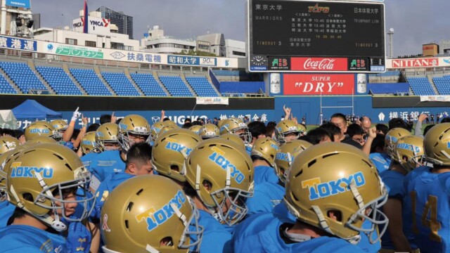 プレーアクションパスを日体DBが見事にインター。ハーフウェイライン付近から、日体の攻撃となる。ここでDL#90大木(3年・麻布)、DL#95本多らが悪い流れを断ち切る見事なdefenseを魅せる。3&outに追い込み、モメンタムを相手に渡さない。攻守交代して自陣10ydからの東大の攻撃。ここはフレッシュさせてもらえずパントとなるが、P#12伊藤(拓)のナイスパントで約50yd回復して、日体の攻撃は敵陣40yd付近から。LB#41中川(廉)のナイスタックルなどでゲインを許さず、3rd downを迎えると、ここでDB#19助川が見事にインターセプト!!キャッチ後のリターンもあり、敵陣からの1st downを獲得する。QBは#12伊藤(拓)。RB#32樋山のランで敵陣24ydsから1st downとなる。その後4th downとなるも、QB#14伊藤(宏)のスニークで見事にギャンブル成功。敵陣10ydsから1st down。最後は、この試合大活躍のRB#32樋山が見事にTDラン。貴重な追加点を獲得する!(東大16-3日体)東大のキックで試合再開し、日体の攻撃。DB#8滝井(2年・東京都立西)のロスタックルなどで3rd down ロングに追い込むが、ここは日体に意地を見せられ、フレッシュされる。その後、4th down ギャンブルの成功や、リバースプレーによるゲインなどで自陣に侵入されるも、DB#28横川(3年・攻玉社)のパスカバーなどでそれ以上の前進は許さない。自陣20yd付近からの4th down10となり、投じられたスクリーンパスはインコンプリート。攻守交代となり、勝利をほぼ確実なところまで手繰り寄せる。その後、東大の攻撃がパントに終わり、試合残り31秒で敵陣20yds付近からの日体の最後の攻撃。日体はロングパスを投じるも、DB#26松山(4年・駒場東邦)らDB陣がシャットアウト。勝利を確実なものとする攻守交代を迎える。最後はニーダウンで試合終了。力の差を見せつけ、TOP8残留を決めた。(東大16-3日体)