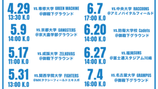 | 第7節 | 11/9(日) 10:00 | 明治大学 | 横浜スタジアム | ●24-42○ |
