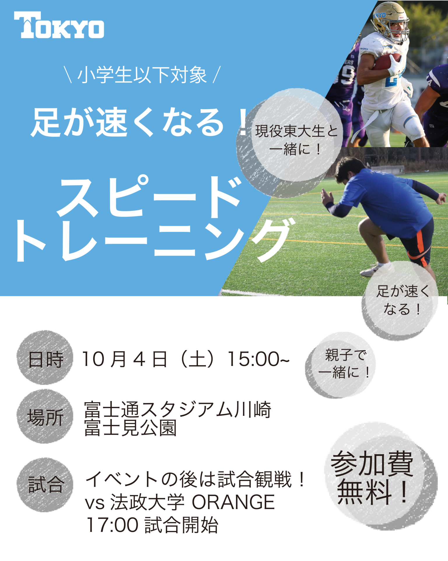 この度、東大アメフト部は10/4(土)富士通スタジアム川崎での法政大学戦前に、富士見公園の芝生広場にて小学生以下対象で足が速くなる!スピードトレーニングを開催します!
